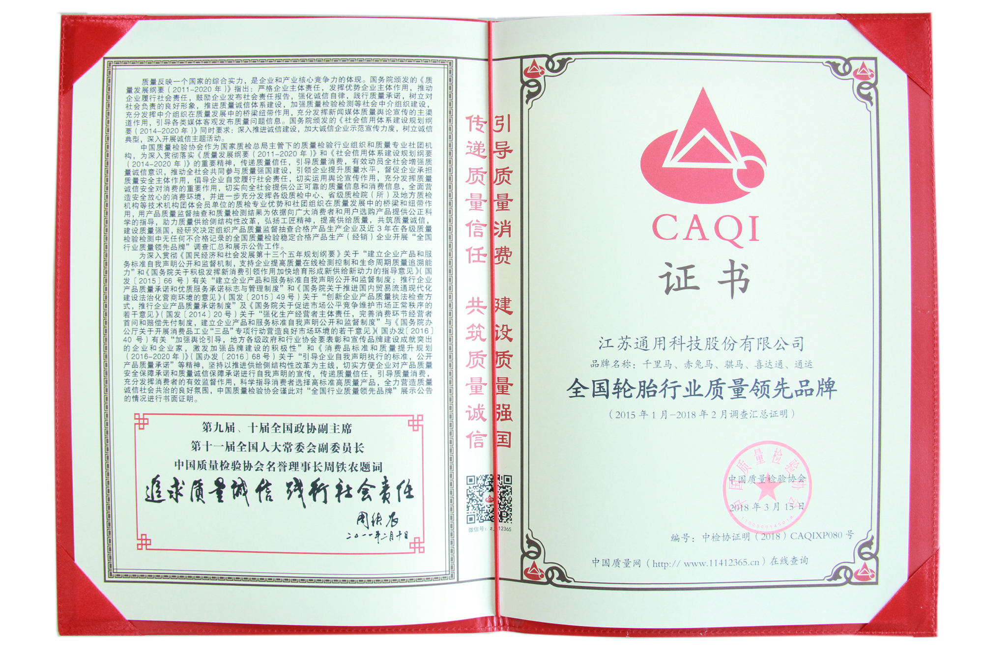 近日,在由國(guó)家質(zhì)檢總局和中國(guó)質(zhì)量檢驗(yàn)協(xié)會(huì)聯(lián)合開(kāi)展的“產(chǎn)品和服務(wù)質(zhì)量誠(chéng)信承諾”主題活動(dòng)中,通用股份榮獲“全國(guó)產(chǎn)品和服務(wù)質(zhì)量誠(chéng)信示范企業(yè)”、“全國(guó)輪胎行業(yè)質(zhì)量領(lǐng)先品牌”稱(chēng)號(hào)。
