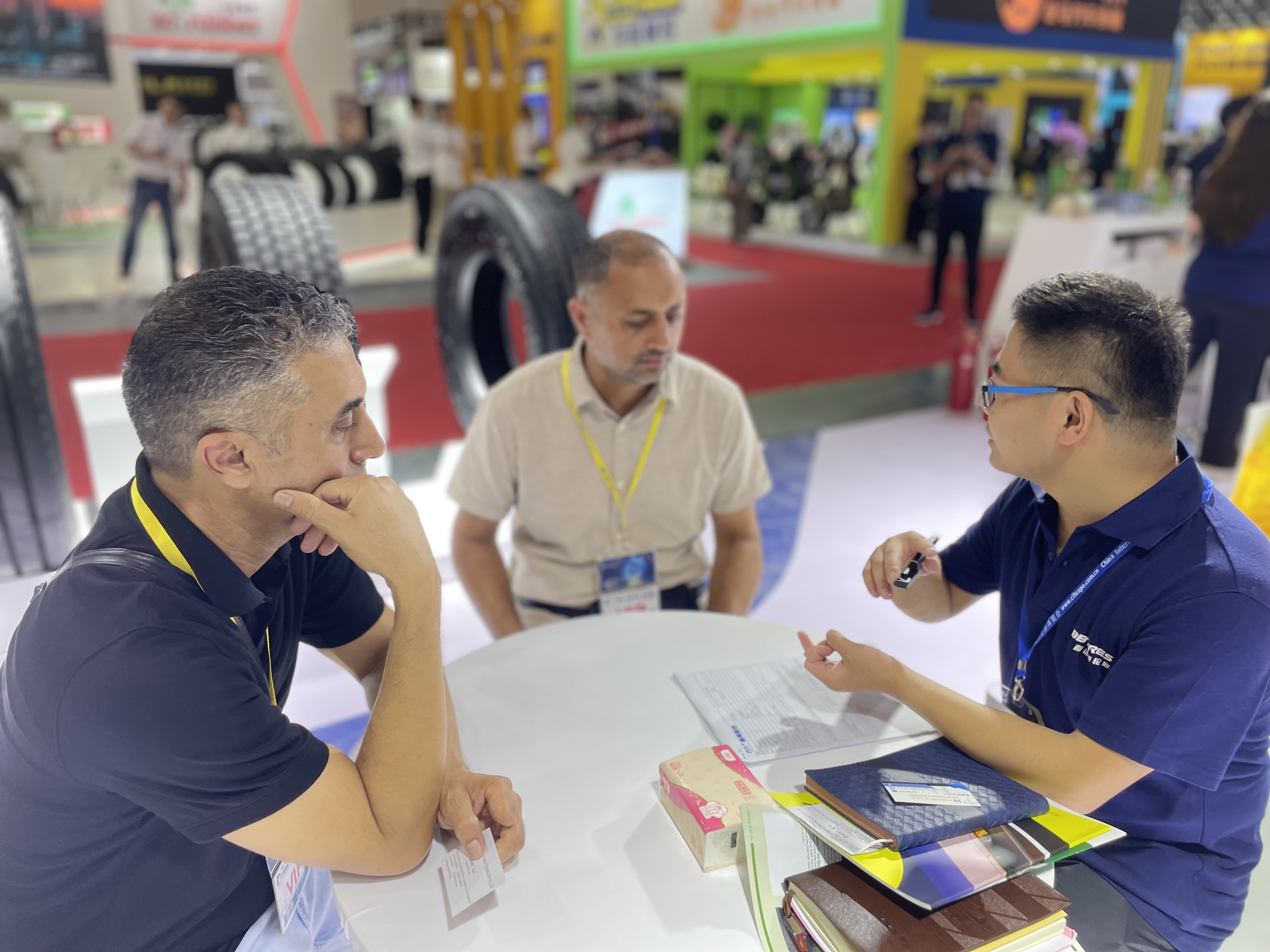 其中,中長途承載胎KTX816,其獨特的花紋塊設計保證了優質的產品性能,耐磨舒適性凸顯,受到客戶的青睞與認可;CAT8、CRT8等越野胎產品,出色的耐磨性、抓地力與牽引性能表現亮眼,不少國內外客商對其表現出濃厚的興趣。除此之外,新能源輪胎EV1、CHP5-EV等系列也是現場聚焦熱點,舒適安全、節油耐磨等性能優勢,亦吸引了不少海外采購商駐足咨詢。