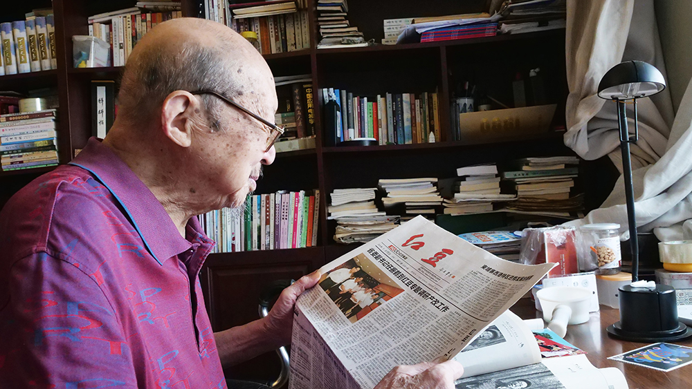 7月29日,今年的七夕前夕,當(dāng)代著名老詩人、作家、文藝評論家丁芒在家中認(rèn)真錄制著對紅豆七夕節(jié)20周年的祝福視頻。中國當(dāng)代詩壇曾有“北臧南丁”之說。丁芒,這位從南通城走出來的大詩人,從抗日戰(zhàn)爭的烽火開始生命的吟唱,80載筆墨為伴,書寫了萬余首激蕩人心的詩篇。面對記者的拜訪,丁芒和其夫人都十分熱情。現(xiàn)已96歲高齡的他,看起來依舊面色紅潤,精神飽滿。在丁芒老先生家中,能夠感受到濃濃的文化氣息,書柜上、書桌上擺滿了各種書籍。雖然已是耄耋之年,丁芒老先生依然每天以書籍為精神食糧,在他的身上,我們看到了一個(gè)詩人對詩詞的忠貞和熱愛,對傳統(tǒng)文化的敬畏和崇拜。